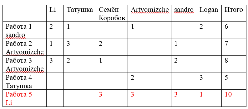 Выбираем три работы и присваиваем баллы: 3, 2 и 1.